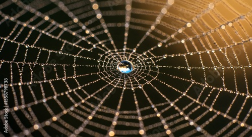 © Rizky, Fototapeta premium Dew-covered spider web in morning light