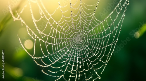 © addymawy, Naklejka premium Dew-covered spider web with intricate patterns and glistening droplets