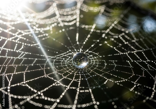 © Zam, Obraz premium Dew covered spider web with sunlight