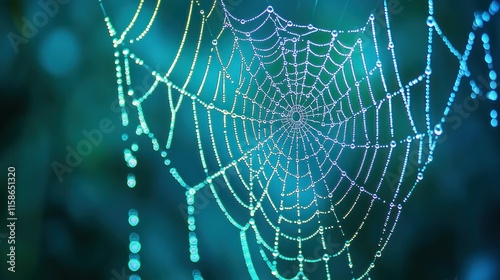 Fototapeta premium Dew-covered spiderweb at dawn.