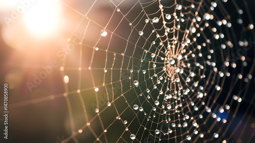 Naklejka premium Dew Covered Spiderweb at Sunrise Nature Macro Photography Intricate Web Detail