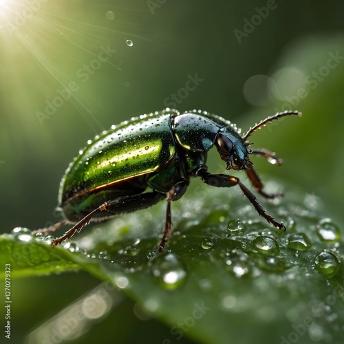 © Chamika, Fototapeta premium Dew-Drenched: The Elaphrus viridis Beetle in a Serene Morning Scene