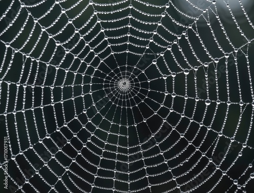 © Ivan, Fototapeta premium Dew drops decorating an intricate spiderweb on dark background