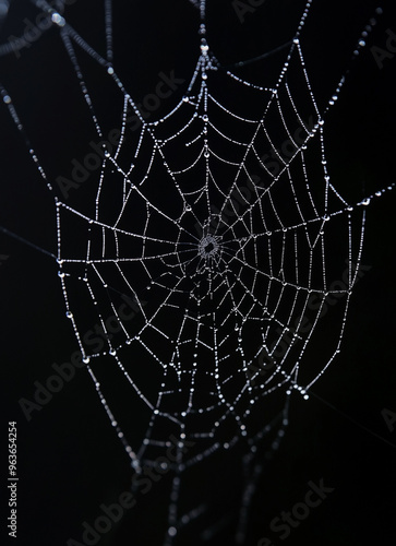Naklejka premium Dew drops glisten on a spider web, reflecting light against a dark backdrop