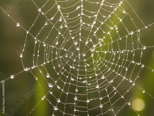 © Machita, Naklejka premium Dew drops on a delicate spider web glisten in morning light, foggy landscape, wet web, spider web patterns