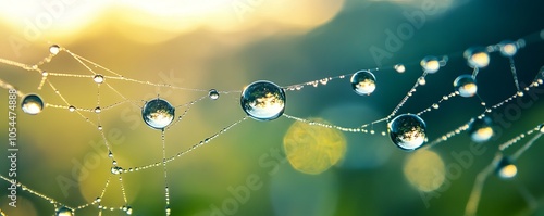 Fototapeta premium Dew drops on a spider web in a sunlit garden, close-up view. Nature beauty and tranquility concept