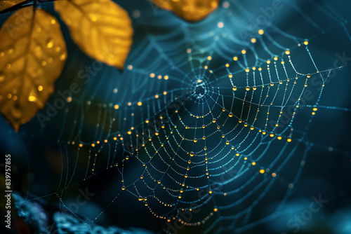 © Anna, Naklejka premium Dew drops on a spider web in dark background, top view, 3d render