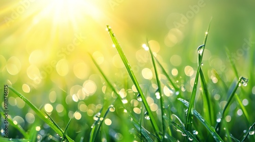 © Arifin Studio, Fototapeta premium Dew drops on blades of grass illuminated by the morning sun.