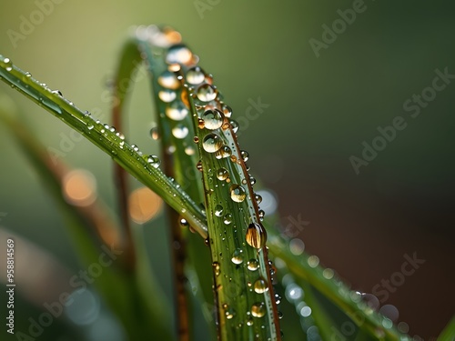 © Sokimimi Studio, Naklejka premium Dew Drops on Green Grass Blades Closeup Macro Photography