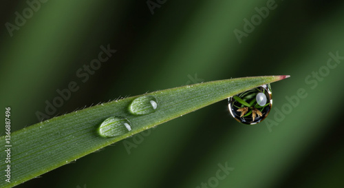 Fototapeta premium Dew drops on leaf tip concept, serene macro nature reflection, clear water...
