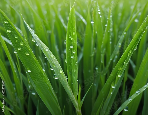 © Teeranan, Obraz premium Dew Drops on Lush Green Grass