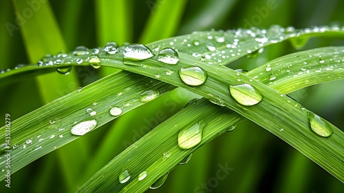 © terat, Naklejka premium Dew Drops on Lush Green Grass Blades - Macro photography