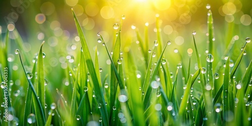 Fototapeta premium Dew Drops on Lush Green Grass in Morning Light - Nature's Beauty Captured in...