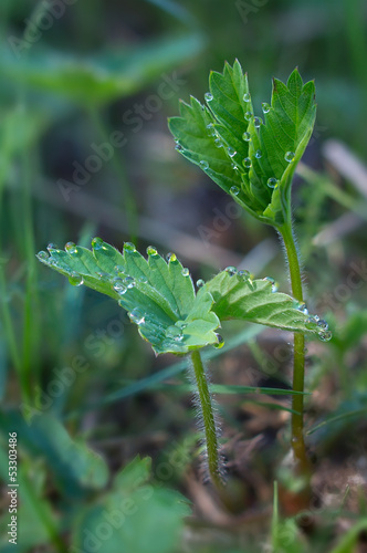 © spanikratov, Obraz premium Dew drops on the leaves of wild strawberry