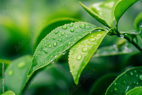 © Kasim, Fototapeta premium Dew drops on vibrant green tea leaves.
