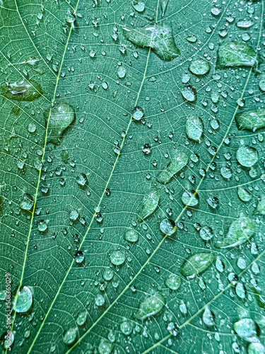 © kowitstockphoto, Fototapeta premium Dew drops water on green leaf in garden