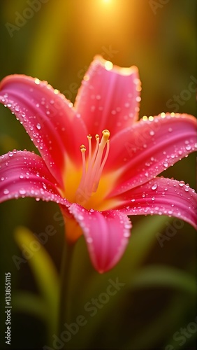 © dukee88, Fototapeta premium Dew-Kissed Crimson Lily in Golden Light