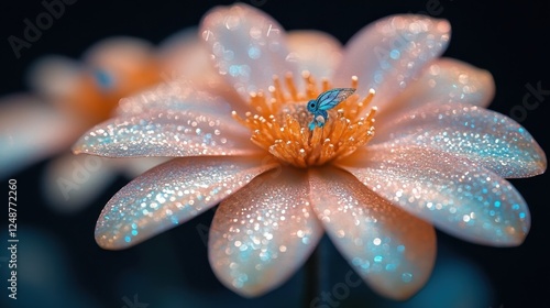 © Budi, Fototapeta premium Dew-kissed flower, insect, dark background, nature macro