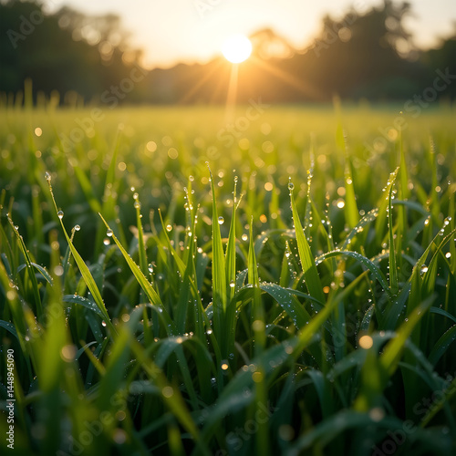 © MST, Fototapeta premium Dew-kissed Grass at Sunrise.A close-up view of a field of grass covered in morning dew, bathed in the warm light of sunrise.