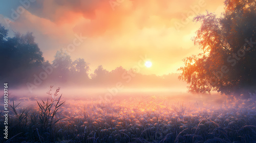 © Thiago, Fototapeta premium Dew-kissed grass beneath a veil of fog wraps the landscape in a mystical shroud, whispers of a lived-in world amidst the misty dawn. Dew-Kissed Veil. Illustration