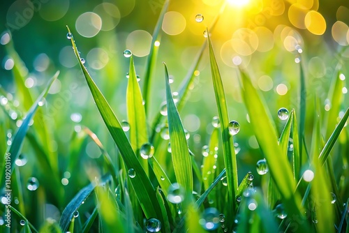 © Apon, Fototapeta premium Dew-kissed grass blades bathed in morning sunlight