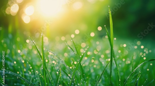 © Fightstar, Fototapeta premium Dew kissed grass in early morning with soft bokeh and glistening droplets