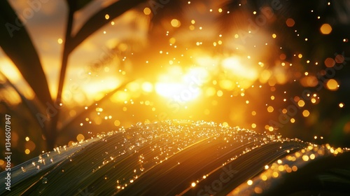 © Dece Std, Obraz premium Dew-kissed leaf at sunset, glowing with golden light and bokeh effect