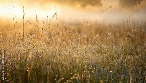Obraz premium Dew-Kissed Meadow: A Golden Sunrise Landscape