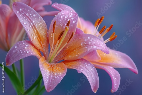 Naklejka premium Dew kissed pink and orange lily closeup