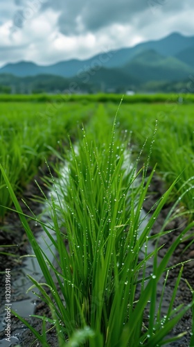 Obraz premium Dew-kissed rice paddy rows, misty mountains in the distance