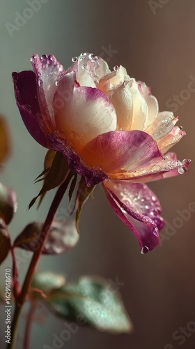 © Bright, Fototapeta premium Dew-kissed rose, creamy yellow and purple hues, side profile
