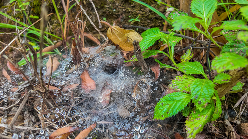 © fotoworld, Fototapeta premium Dew-kissed spider web with tunnel-like entrance nestled among vibrant green foliage and autumnal leavesperfect for natural backgrounds or educational content on ecosystems, Earth day concept