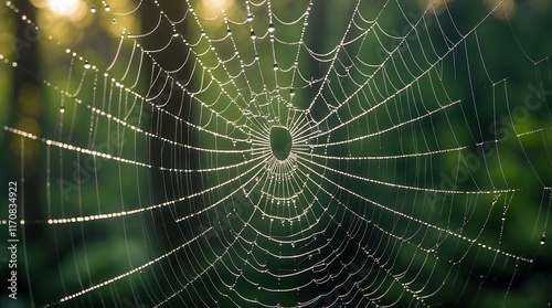 © Eidoran, Naklejka premium Dew-Kissed Spiderweb: A Symphony of Nature's Intricacy