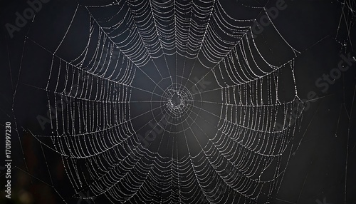 © Batrek, Fototapeta premium Dew-kissed spiderweb exhibits intricate patterns against a dark backdrop.