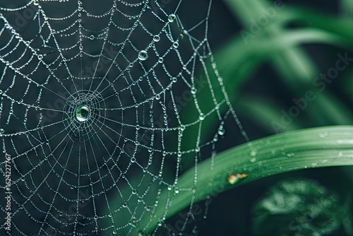 Obraz premium Dew-kissed spiderweb, intricate design