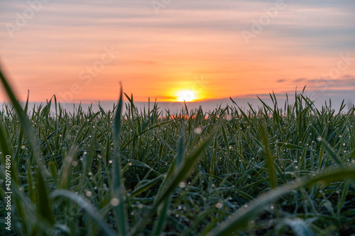 Fototapeta premium Dew on grass in sunrise time
