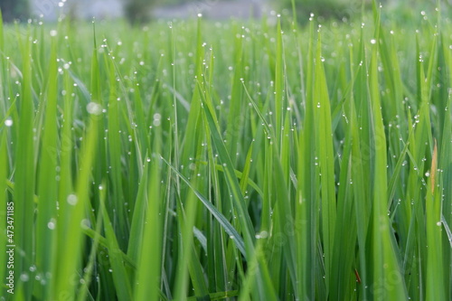 © Johan Wahyudi, Obraz premium dew on grass rice field