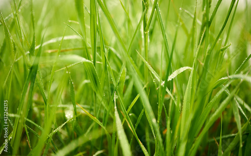 Fototapeta premium dew on green grass illuminated by morning light