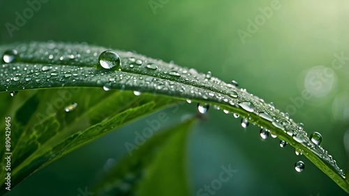 Obraz premium dew, water, a drop of morning dew on a weed leaf on a green background
