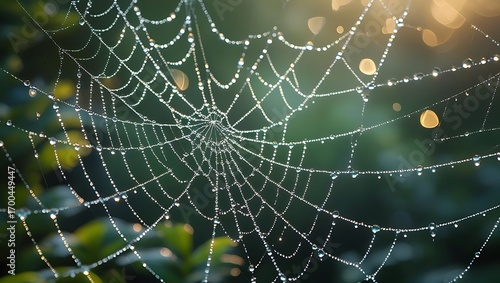 Fototapeta premium Dewdrops adorning a spiderweb in morning sunlight