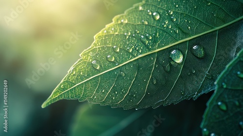 Fototapeta premium Dewdrops on a Leaf: A Serene Nature Photography