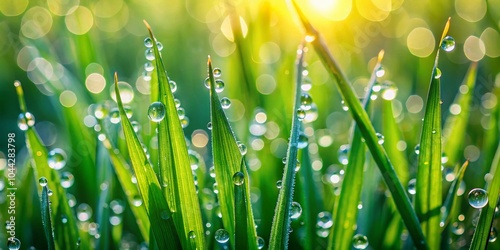 © Four888, Fototapeta premium Dewdrops on Grass: Capturing Nature's Beauty in Macro Photography