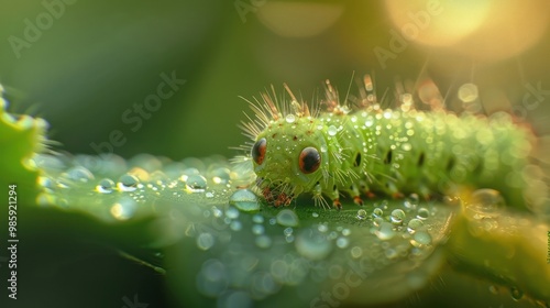 © Imsuniyah, Naklejka premium Dewy Caterpillar on a Leaf