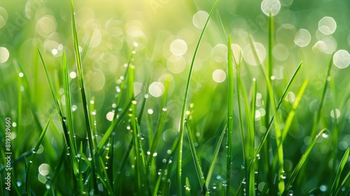 Fototapeta premium Dewy grass in the morning light, with droplets forming perfect beads that glisten against the vibrant green.
