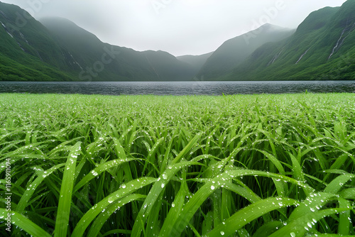 Fototapeta premium Dewy Grass, Misty Mountain Lake