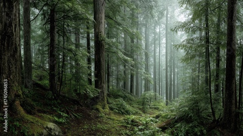 © Parasol Lab, Fototapeta premium Dewy Morning Western hemlock forest panorama