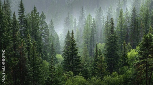 © Parasol Lab, Obraz premium Dewy Morning White spruce forest panorama