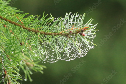 © Rueger, Naklejka premium Dewy spiderweb on spruce needles