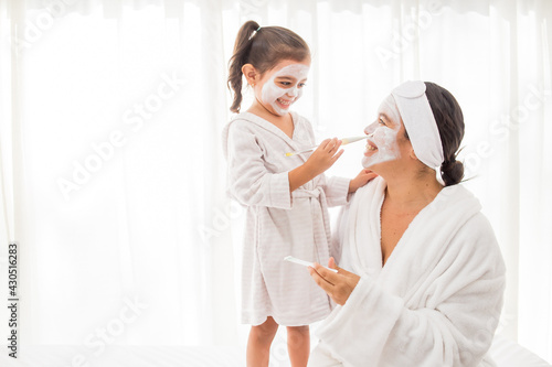 Obraz premium dia de Spa mama e hija con mascarilla blanca y fondo blanco