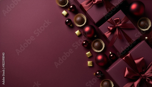 © popadynets, Obraz premium Diagonal Flat Lay of Premium Chocolate Truffles and Maroon Wrapped Gifts